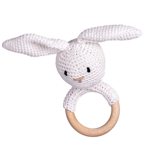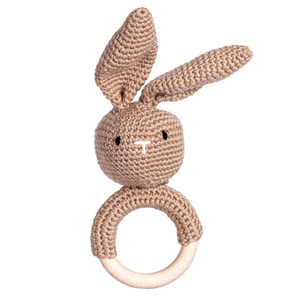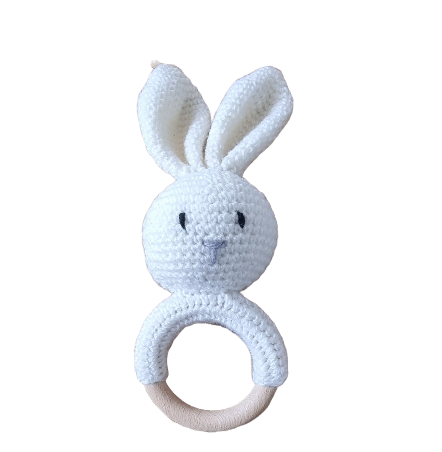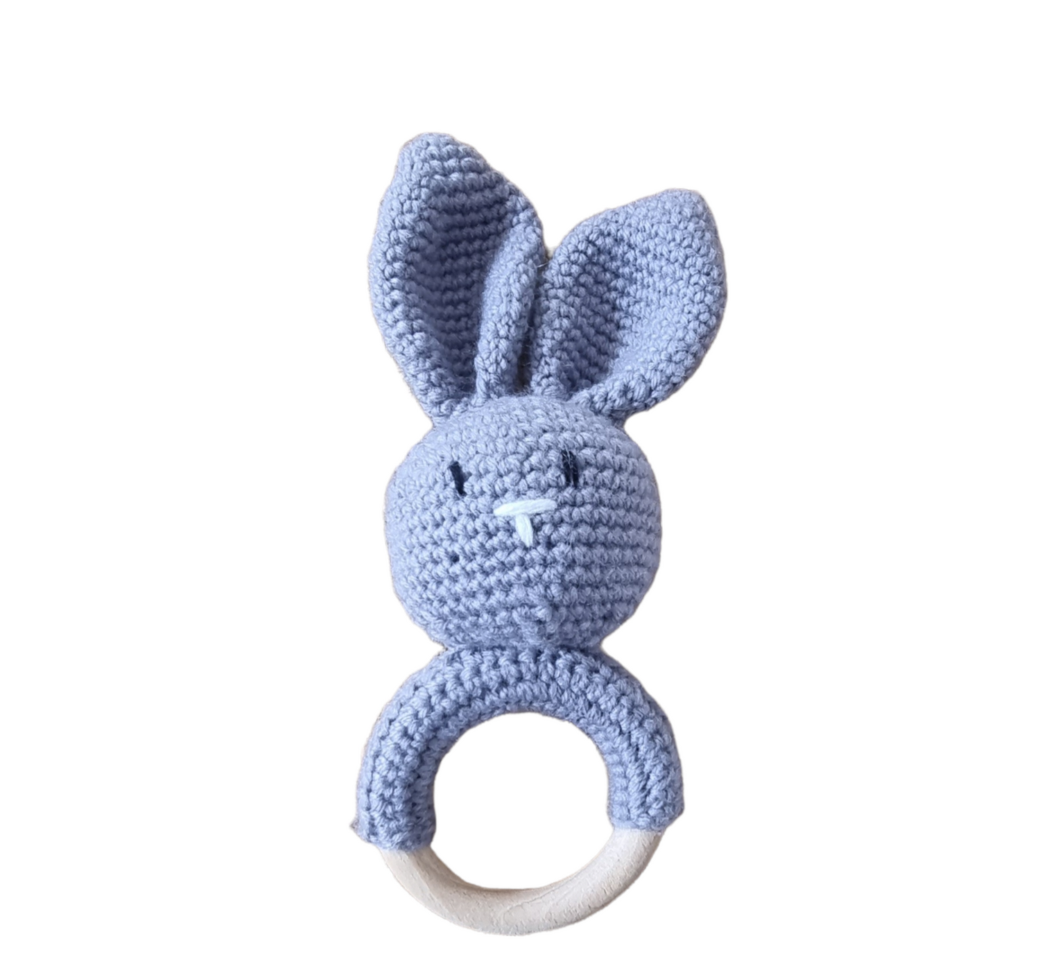Our hand-crocheted rabbit rattle is made of 100% wool and is the perfect toy for babies. The wooden ring makes it easy to grip, ideal for biting and chewing when your little one's gums are itchy. The cute animal has a small rattle inside, which stimulates your baby's motor skills and affects their visual and auditory perception.