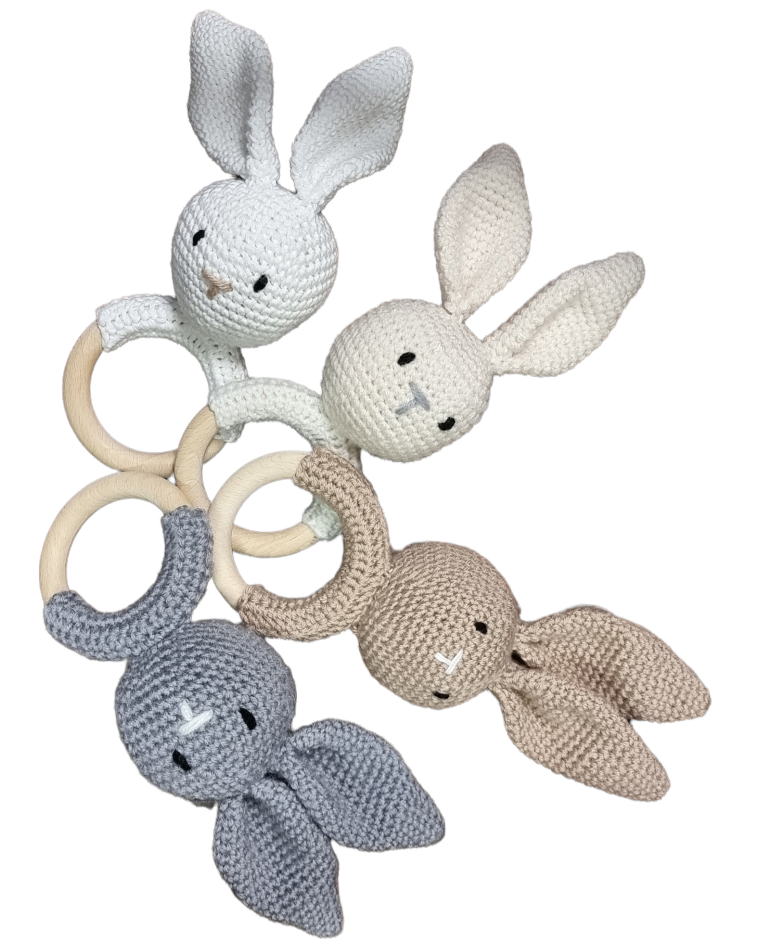 Crocheted rabbit rattle gently stimulates hearing development and strengthens hand-eye coordination. Sets are also available at a more affordable price. These sets are the perfect gift for a newborn or a little older child. For personalized products, contact us by email.