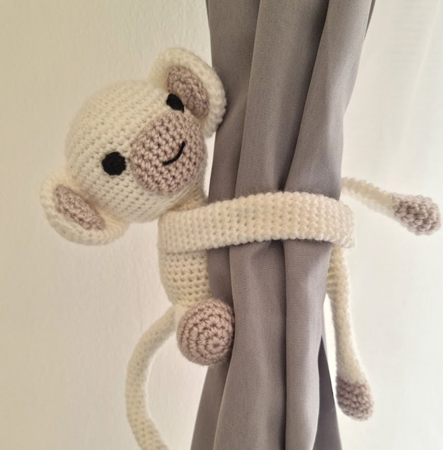 Naša ljubka pletena opica z dolgimi rokami je vsestranski dodatek za vsako otroško sobico. Lahko služi kot držalo za zavese ali kot praktična igračka. Ta kvačkana opica je idealen in čudovit dodatek, ki bo popestril prostor in zabaval vašega malčka.